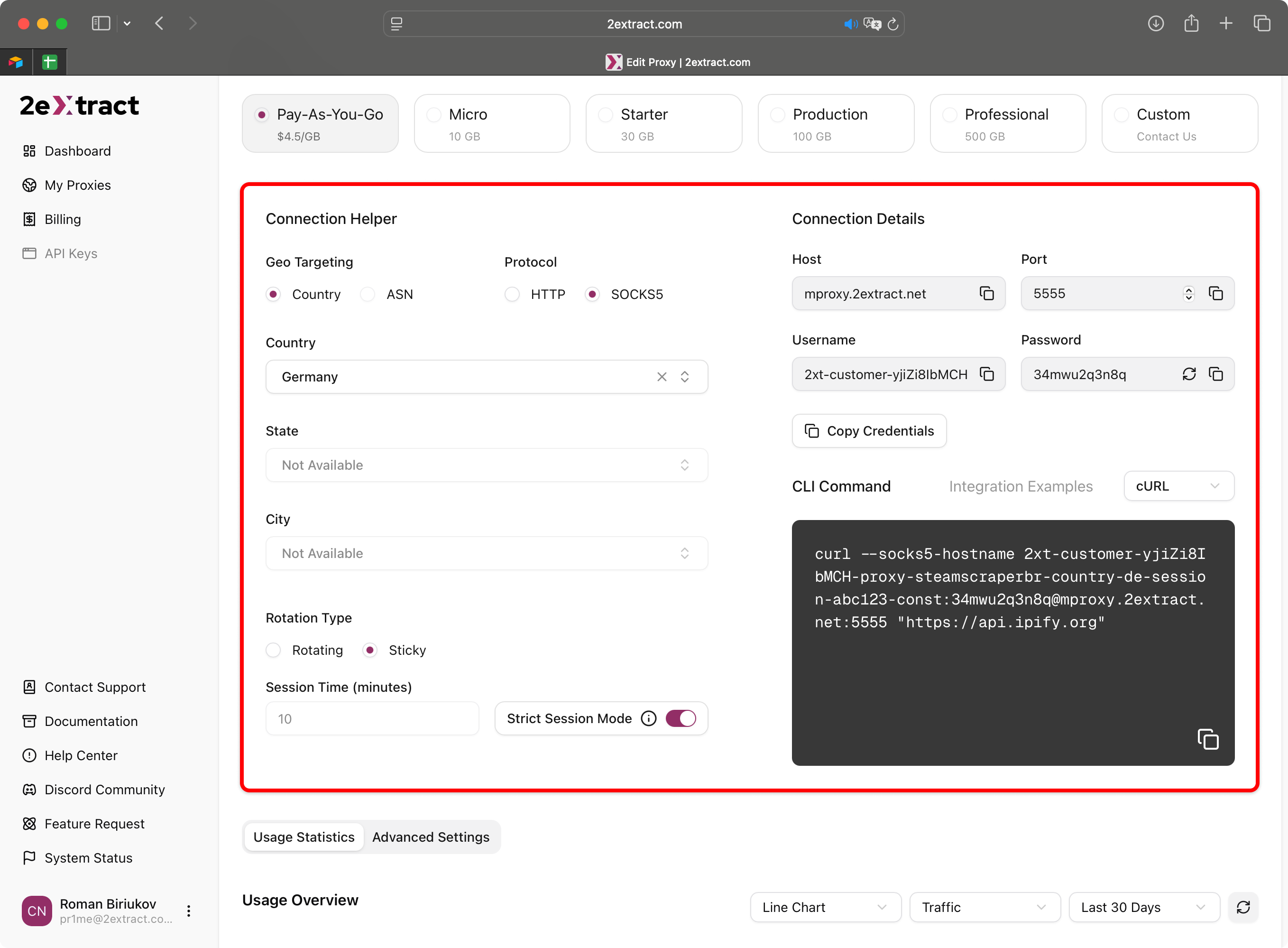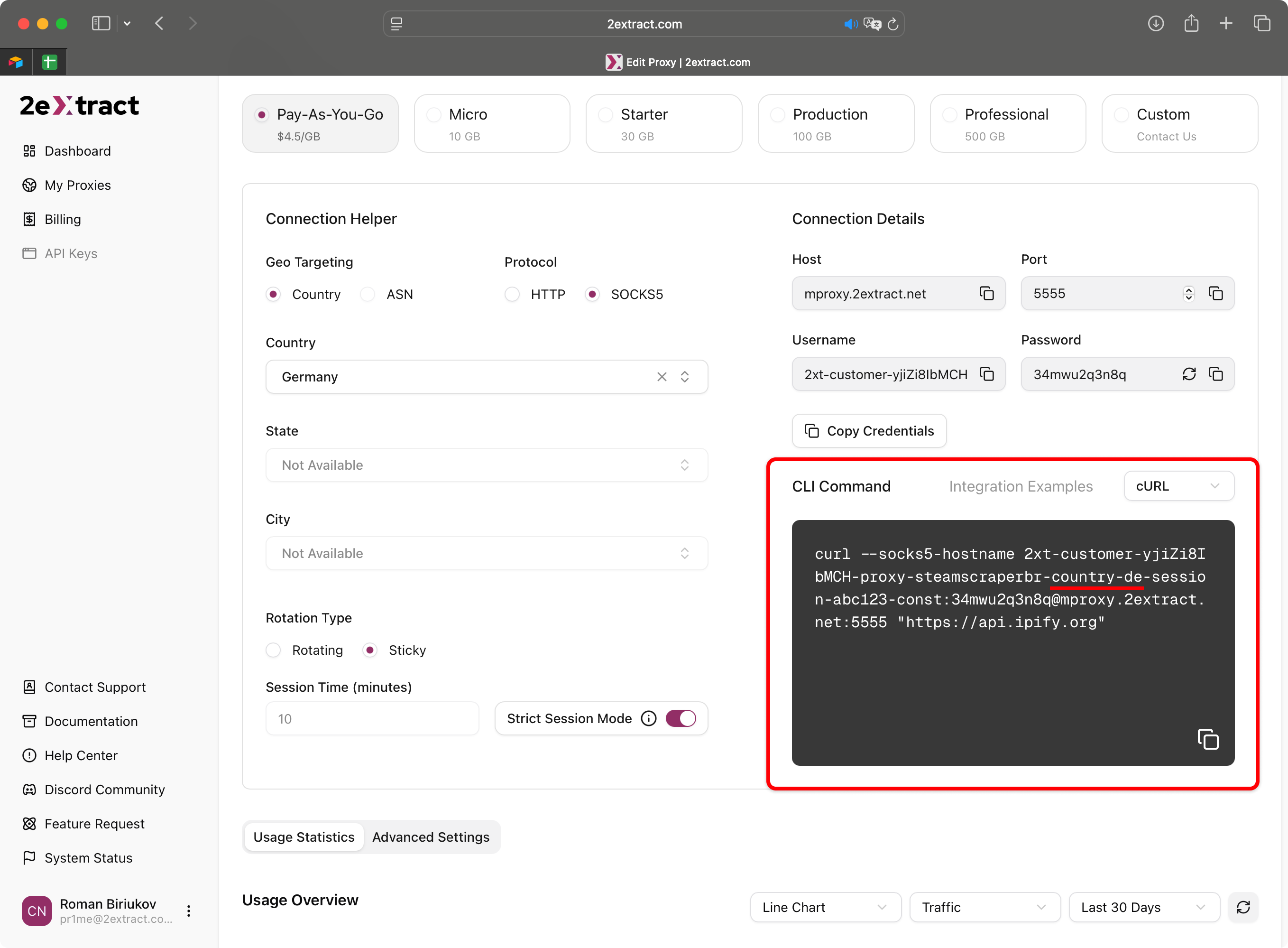 are automatically added or removed from your username string. - The Code in “Integration Examples”: The entire code snippet (for cURL, Python, etc.) rebuilds itself with the newly generated username, ready for you to copy and paste.
