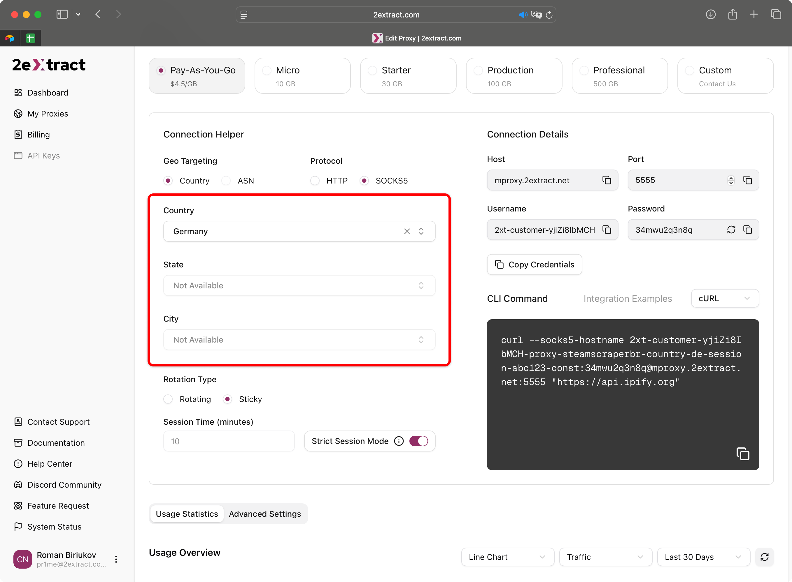 As 'Germany' is selected in the helper, the username and cURL command update instantly.